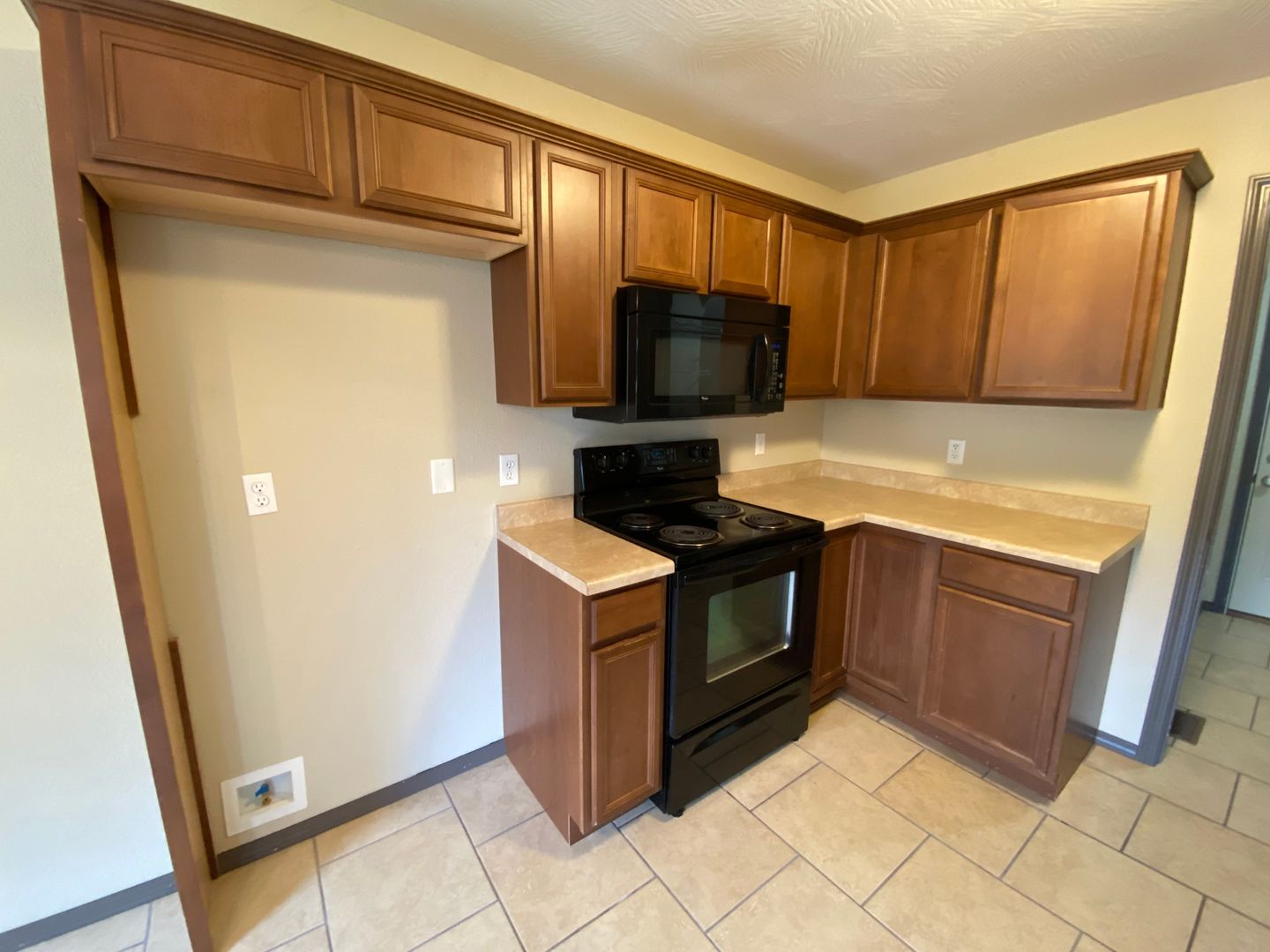 Kitchen equipped with stove, dishwasher, and microwave (no fridge)