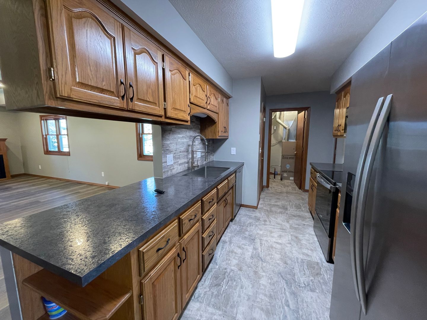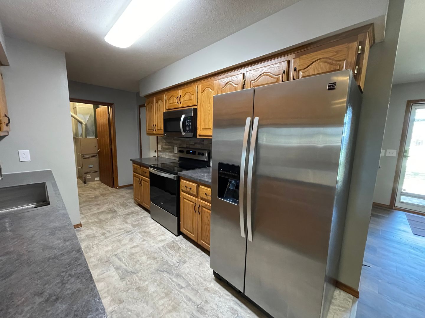 Kitchen equipped with fridge, stove, dishwasher, and microwave