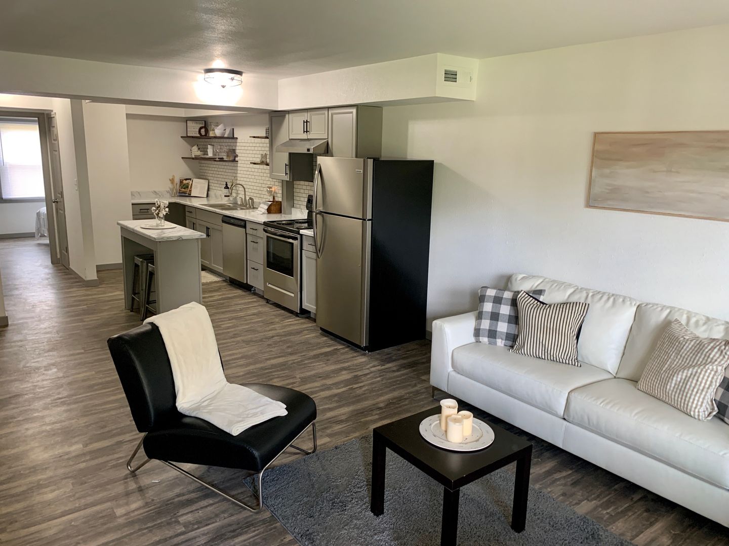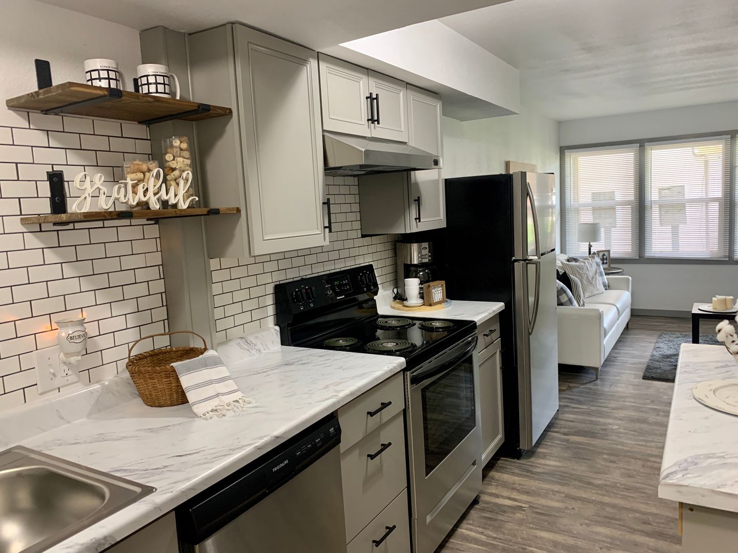 Kitchen equipped with stainless fridge, stove, and dishwasher