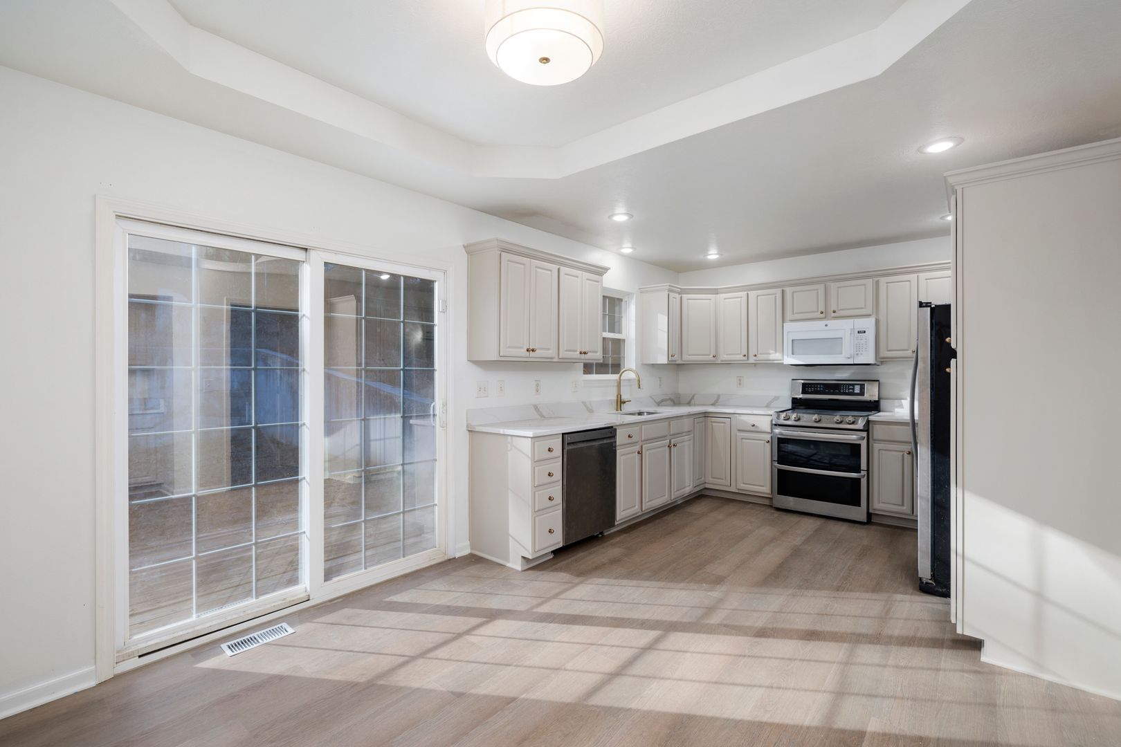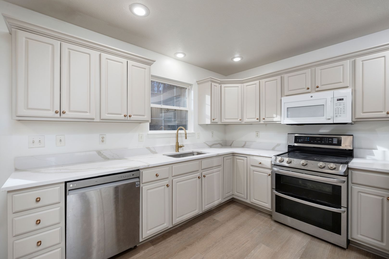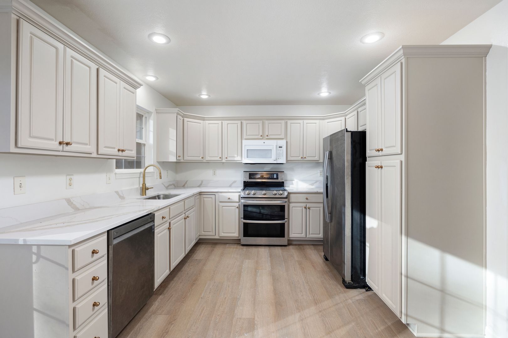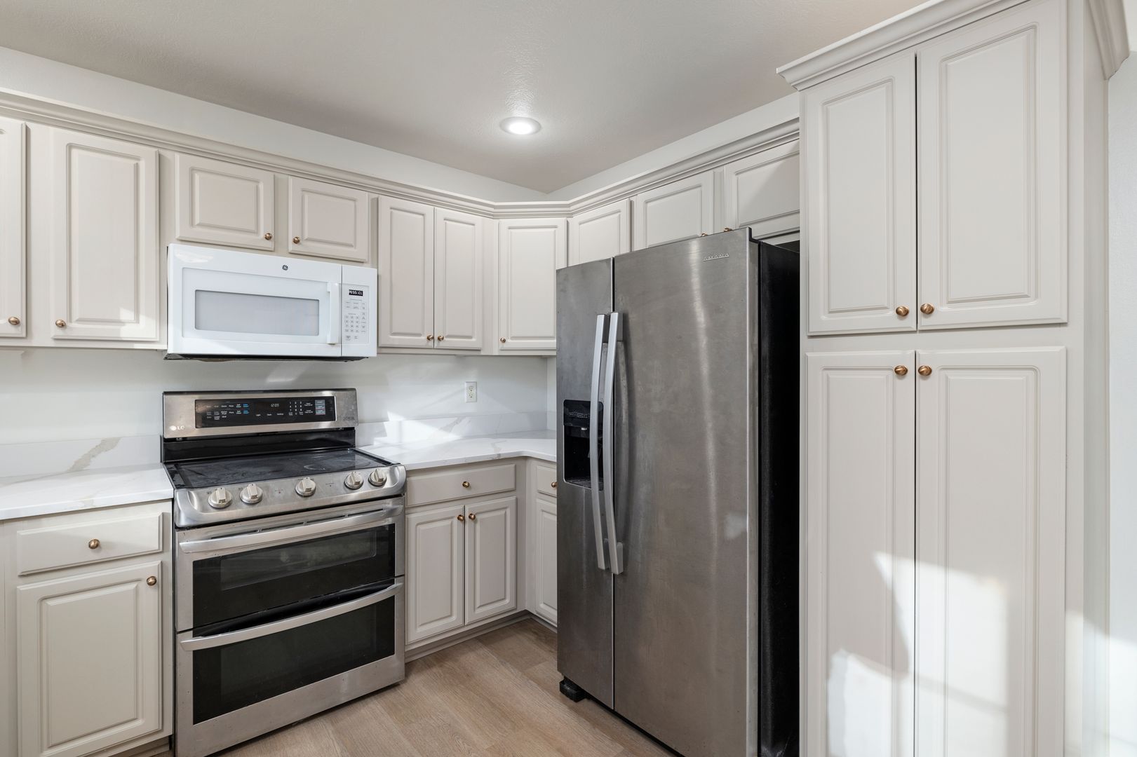 Kitchen equipped with nice stainless steel fridge, stove, and dishwasher + microwave