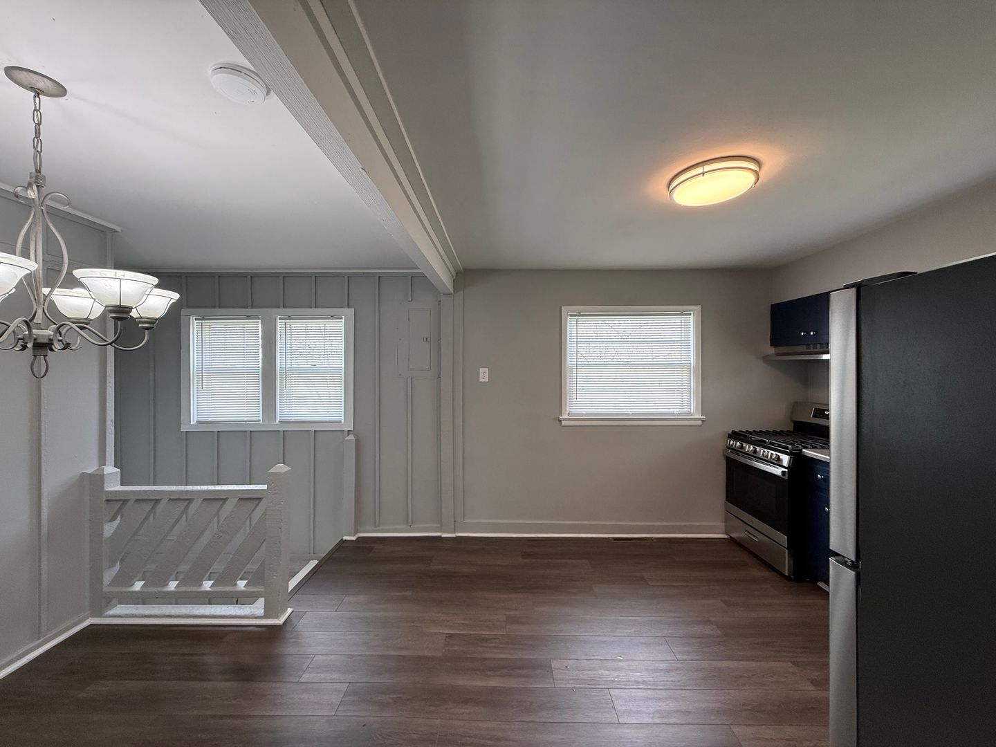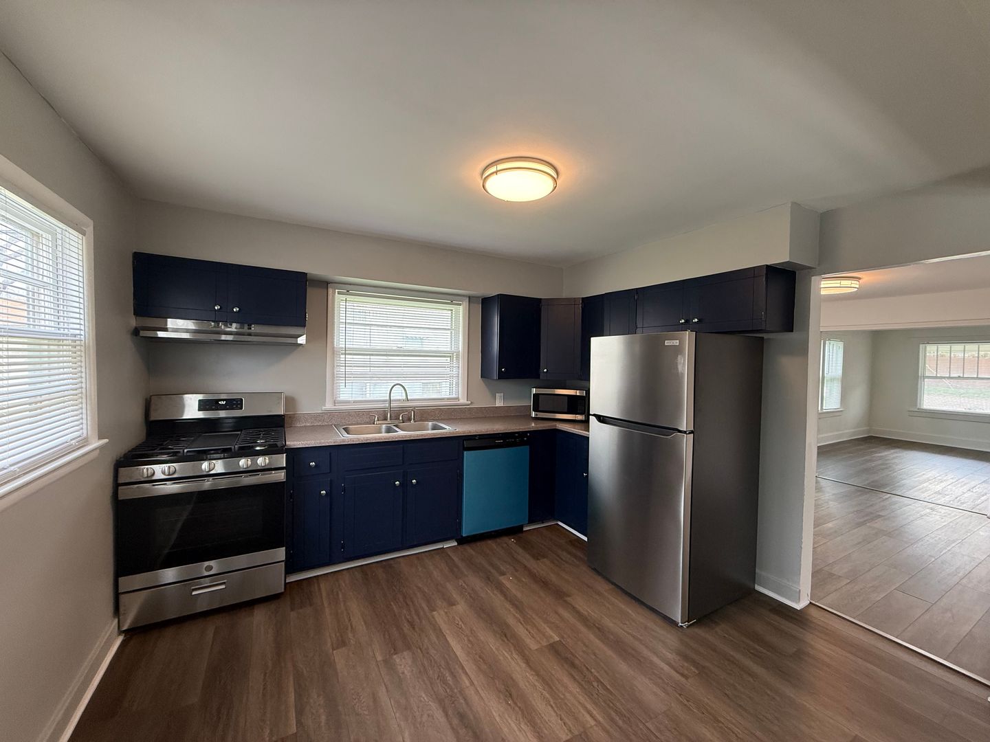 Kitchen equipped with new appliances including fridge, stove, dishwasher and microwave