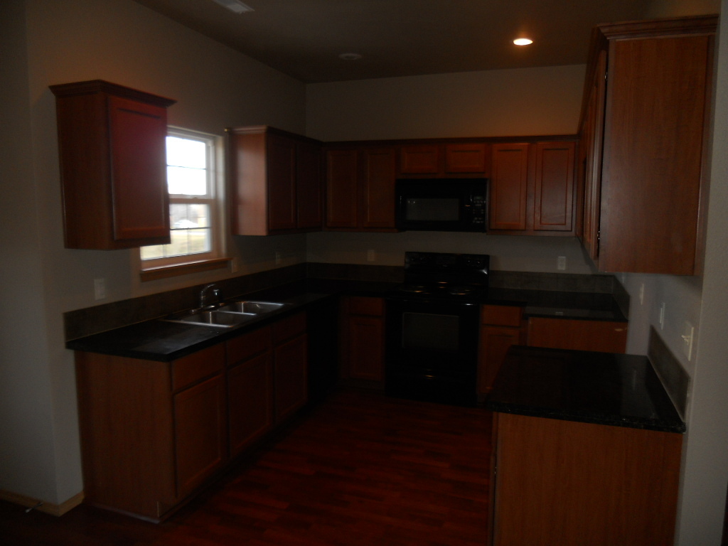 Kitchen equipped with fridge, stove, dishwasher, and microwave