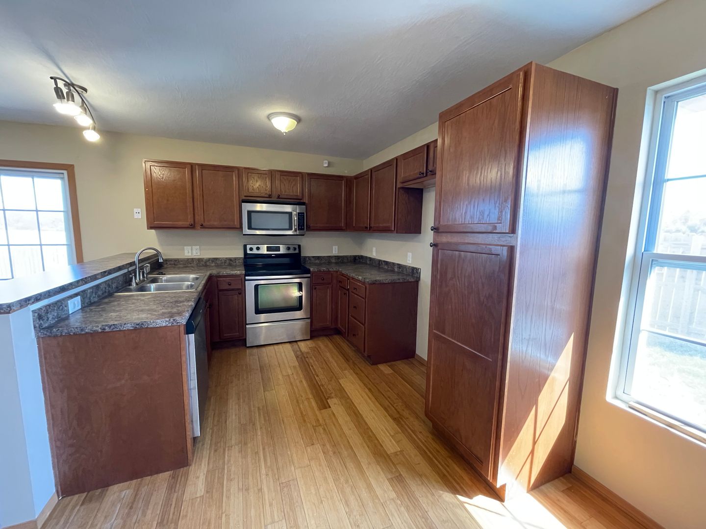 Kitchen equipped with stove, dishwasher, and microwave (no fridge)