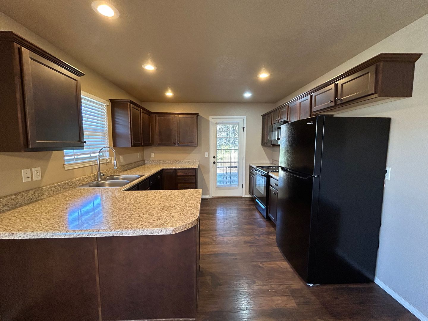 Kitchen equipped with fridge, stove, dishwasher, and microwave provided