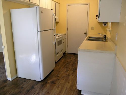 Kitchen equipped with fridge, stove, and dishwasher