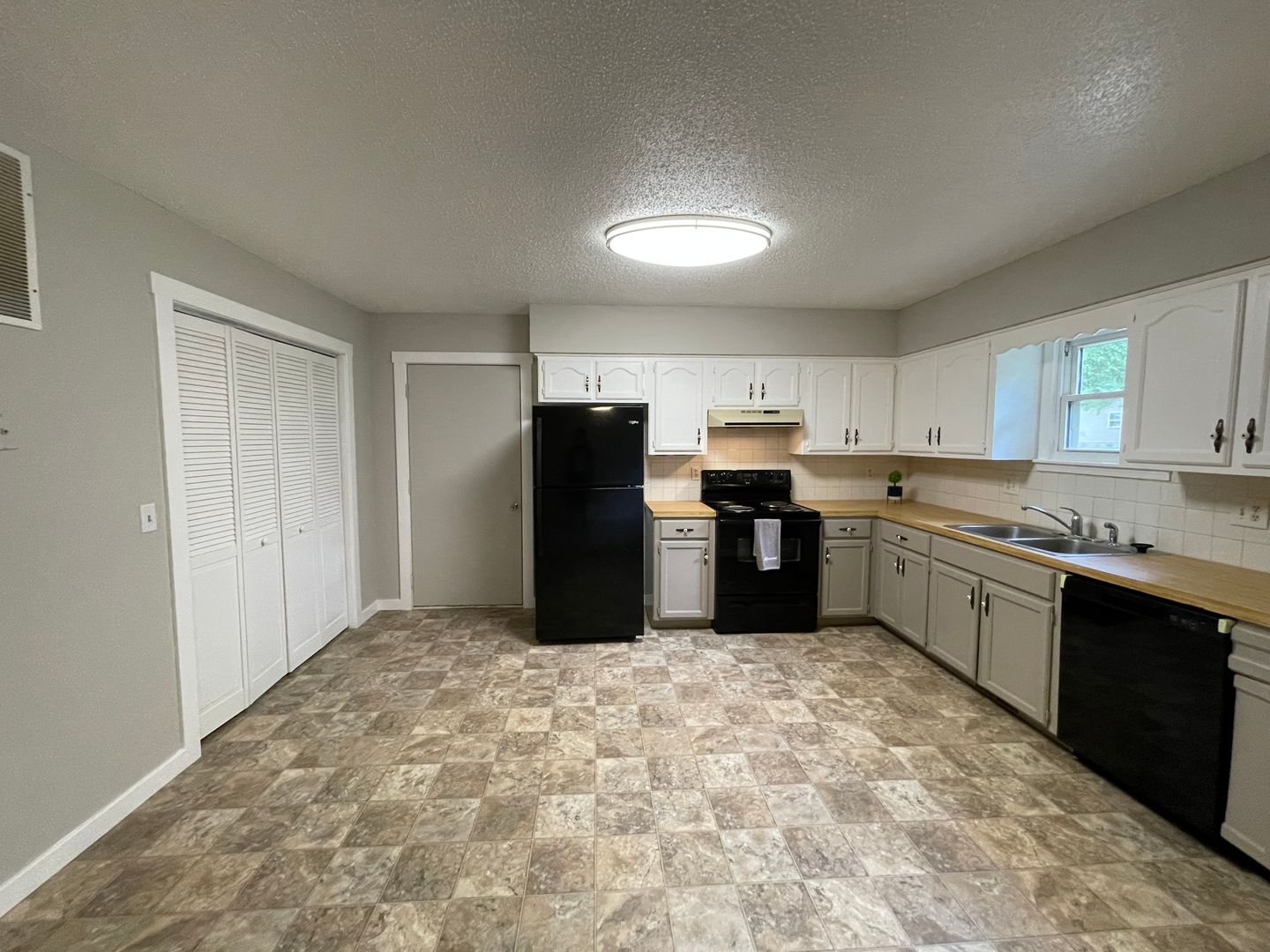 Kitchen equipped with fefrigerator, stove, and dishwasher