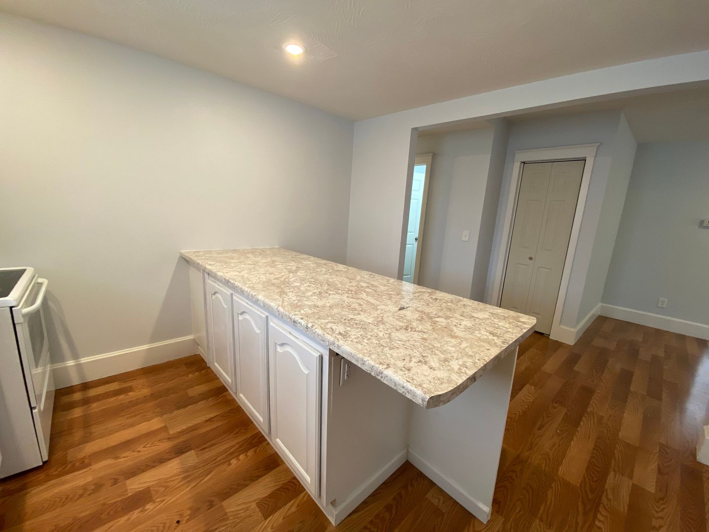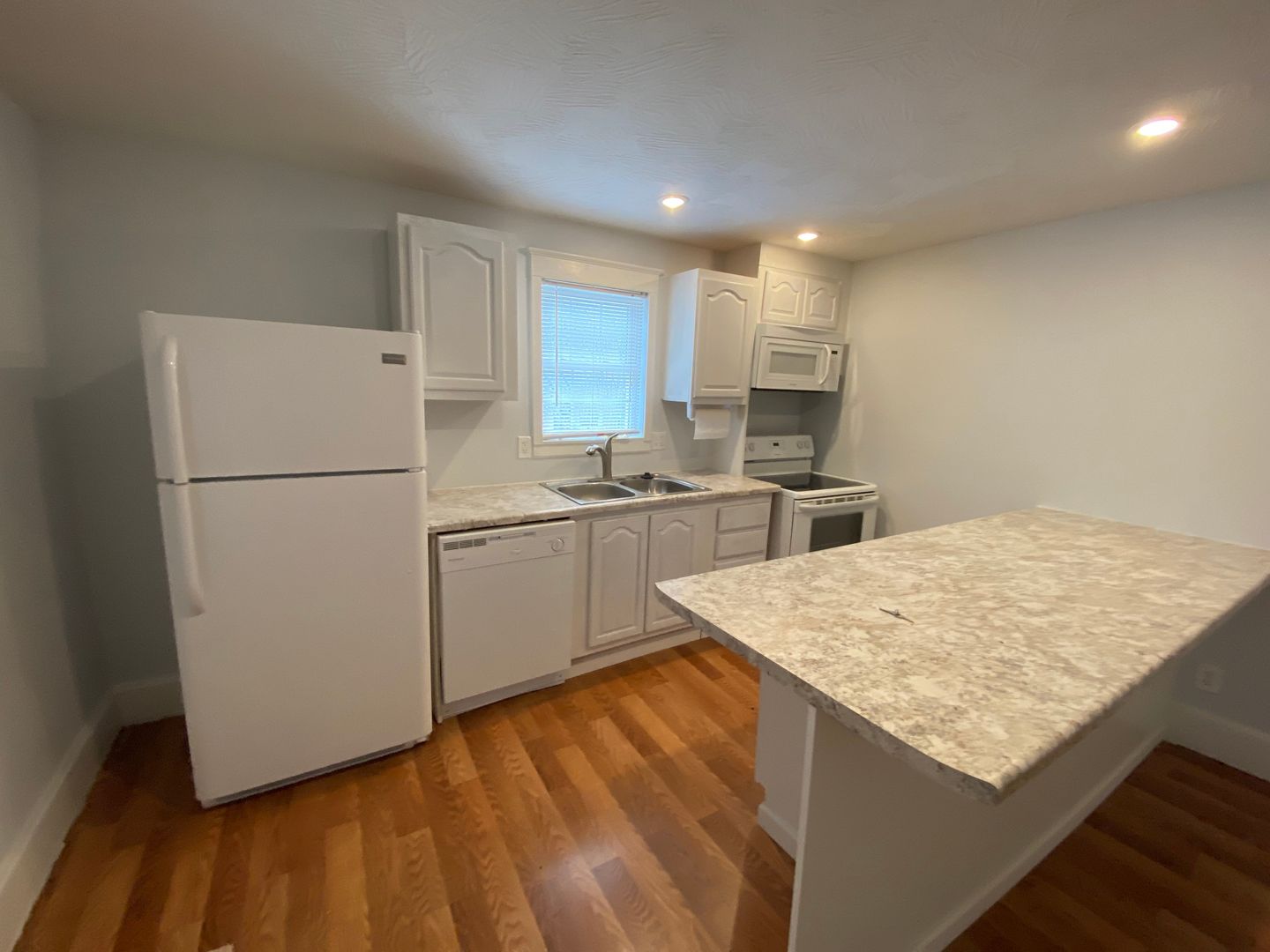 Kitchen equipped with fridge, stove, dishwasher, and microwave