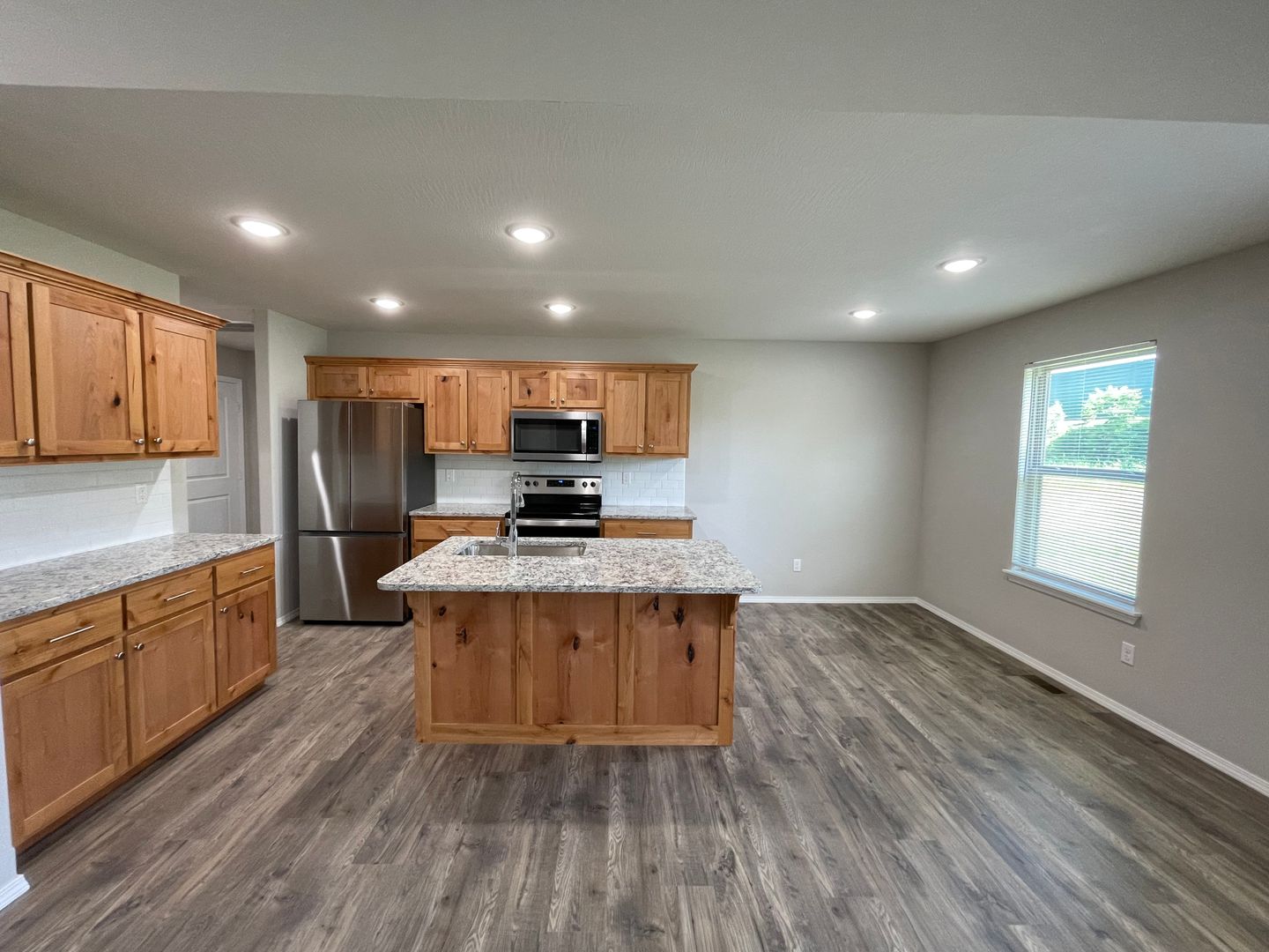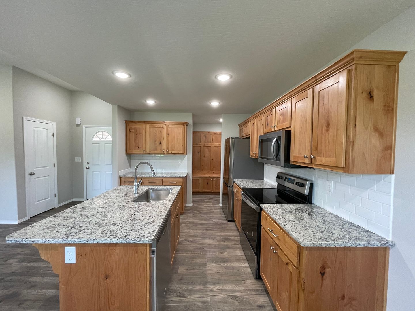 Stainless appliances including fridge, stove, dishwasher, and microwave