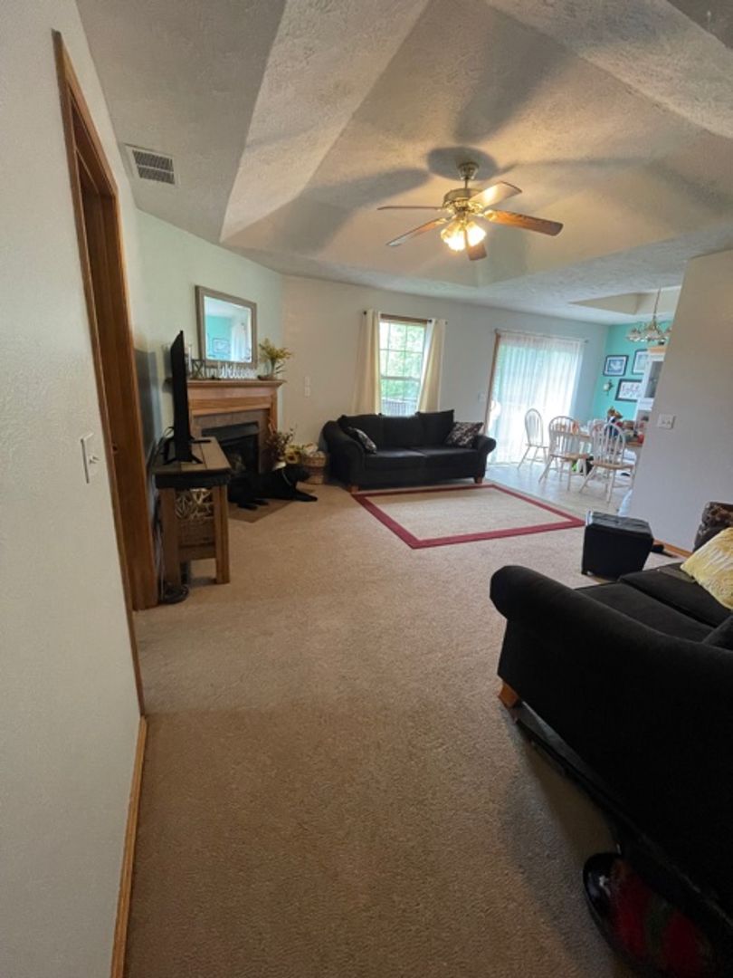 Living room has fireplace