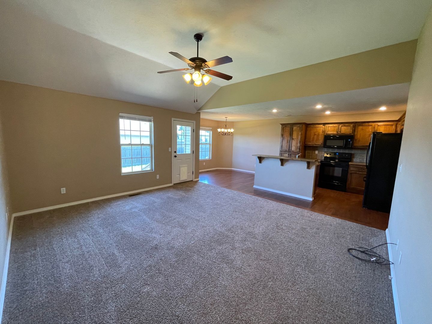 Kitchen equipped with black fridge, stove, dishwasher, and microwave