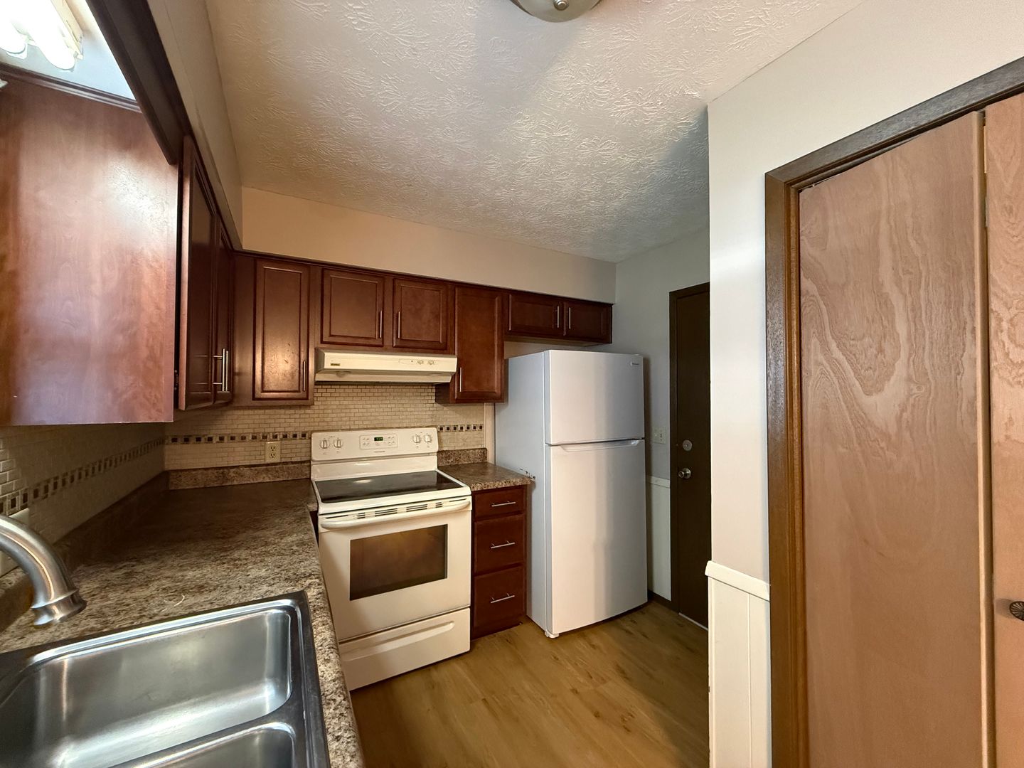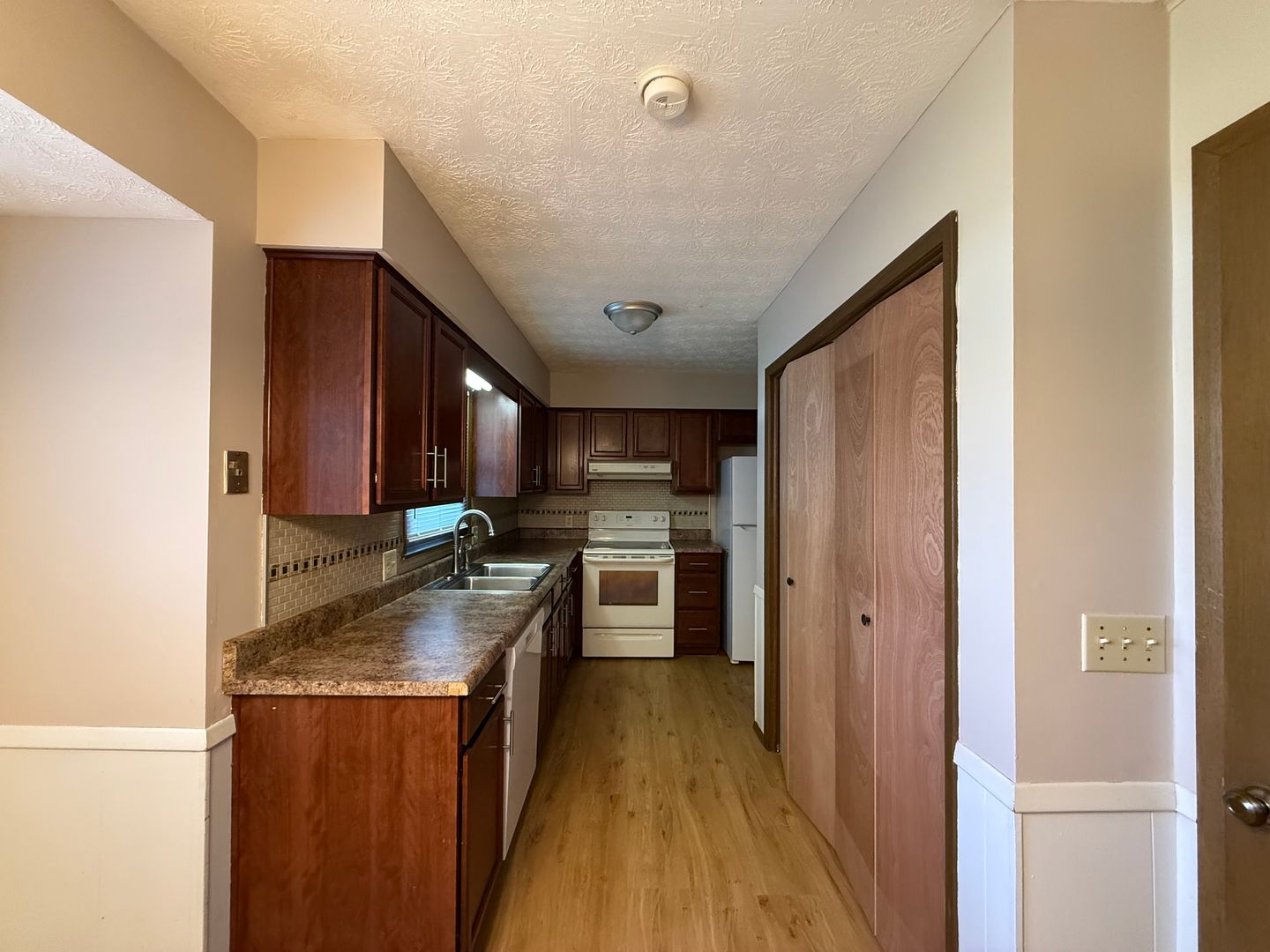 Kitchen equipped with fridge, stove, and dishwasher provided