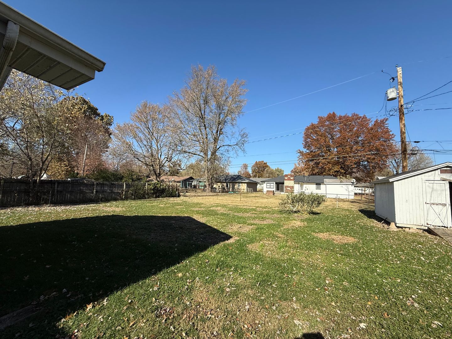 Fenced yard with storage shed