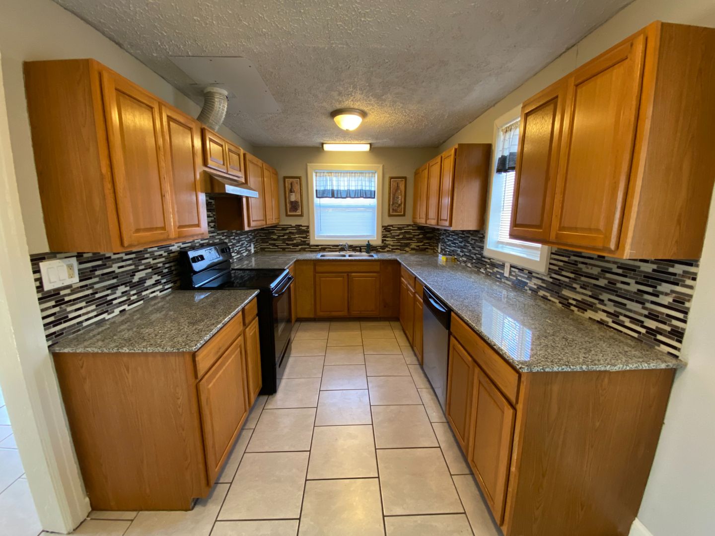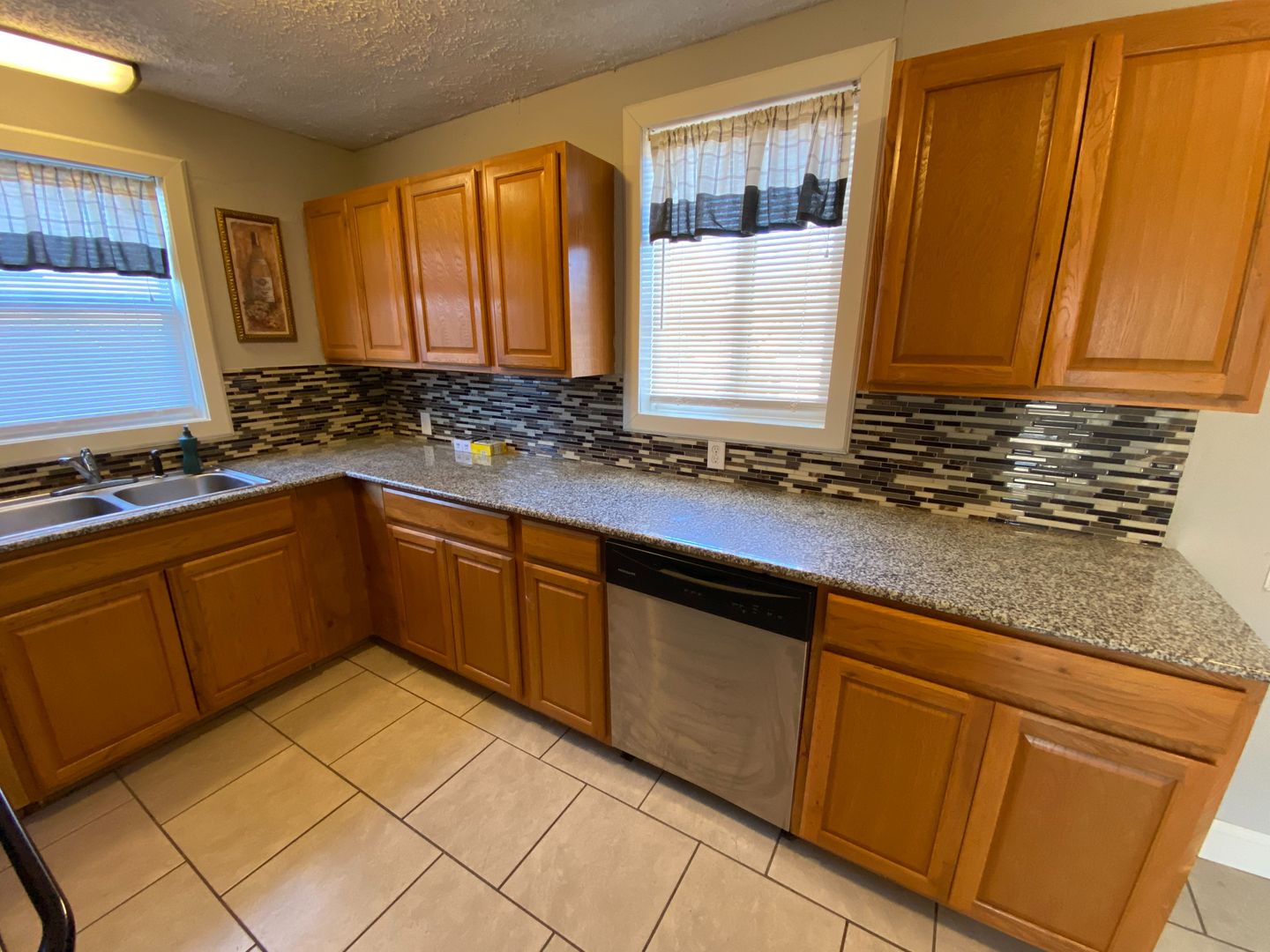 Kitchen equipped with stove, dishwasher, and fridge