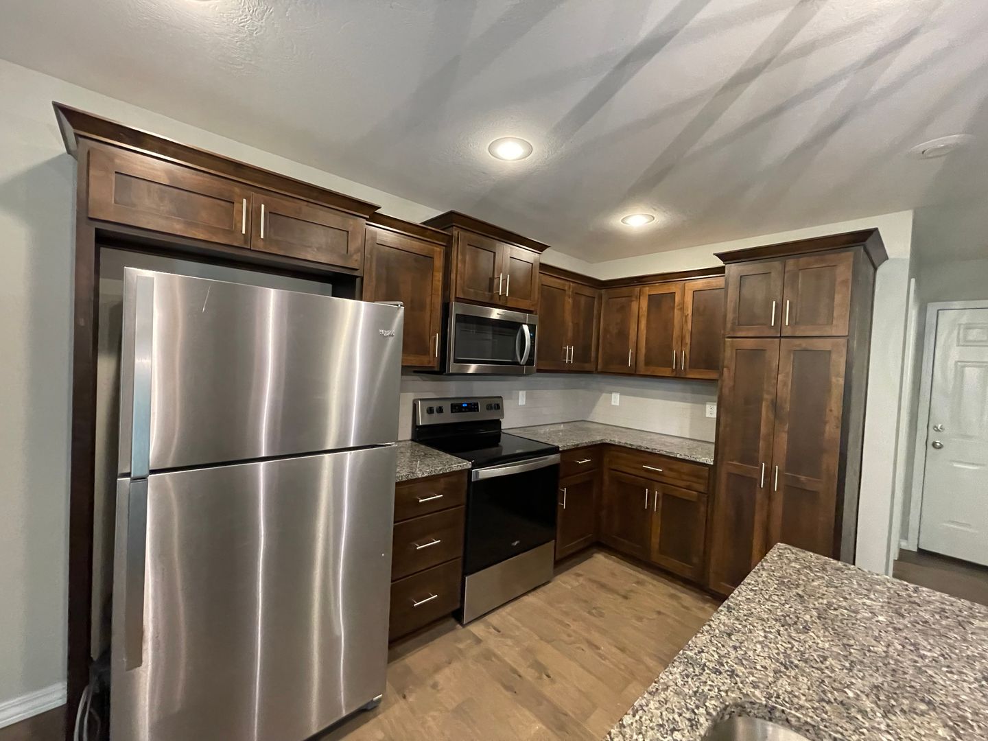Kitchen equipped with stainless fridge, stove, microwave and dishwasher