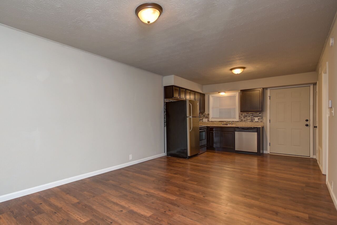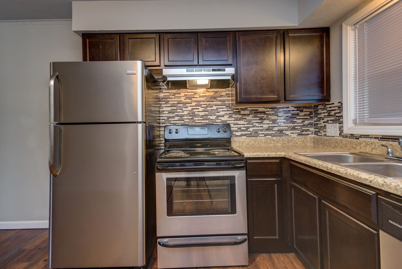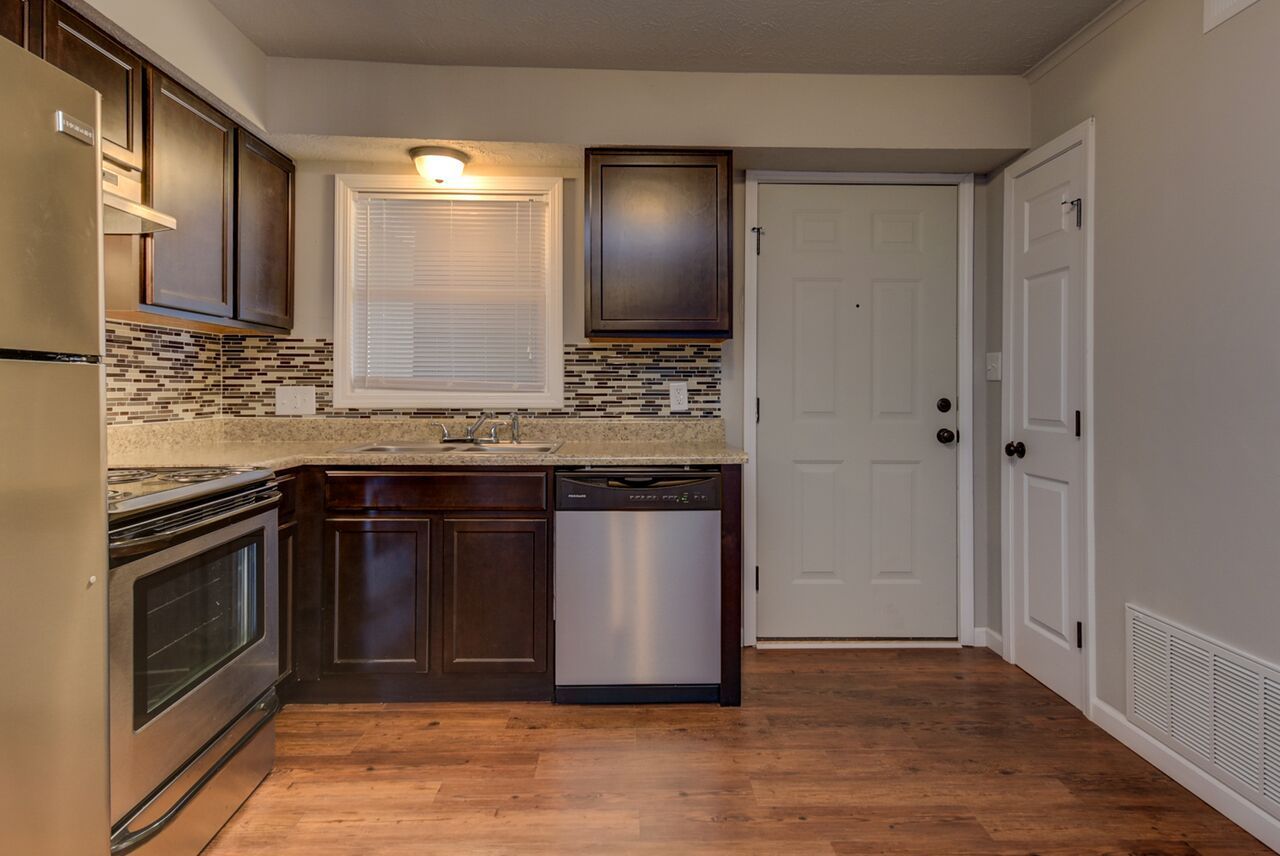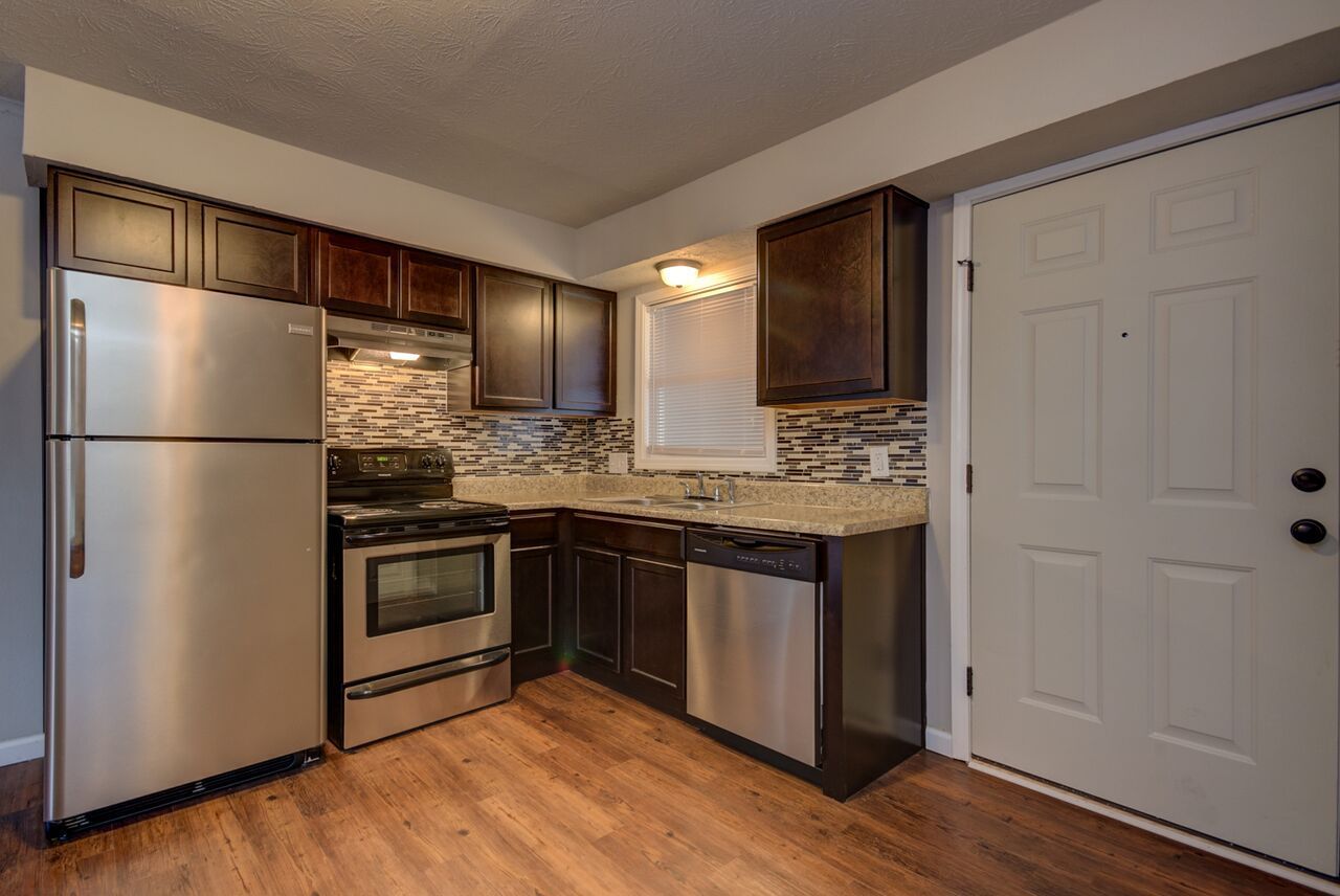 Kitchen equipped with stainless fridge, stove, and dishwasher