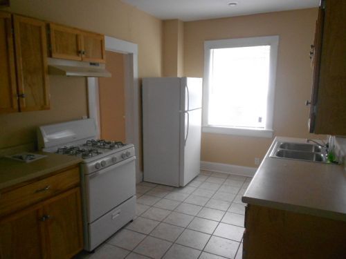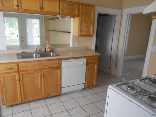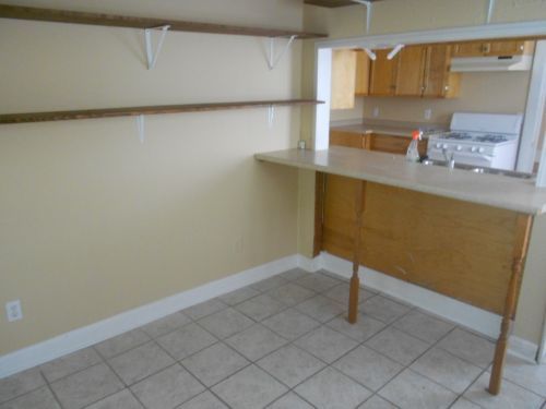 Spacious tiled kitchen with fridge, stove, and dishwasher provided