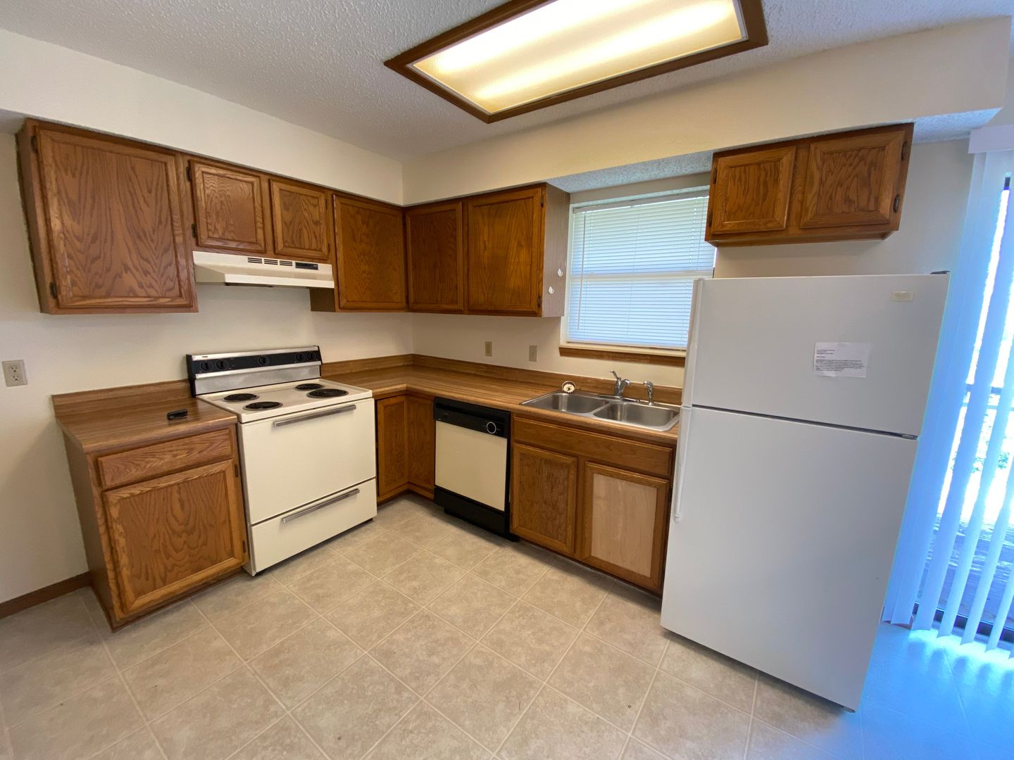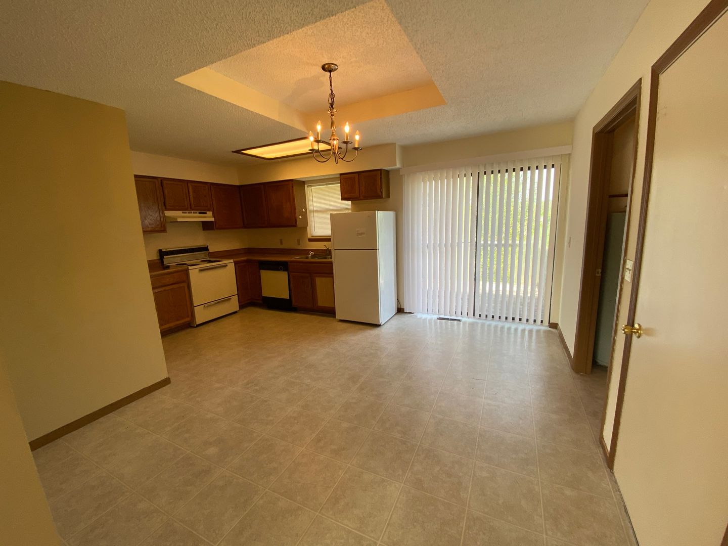 Kitchen equipped with dishwasher, stove, and fridge