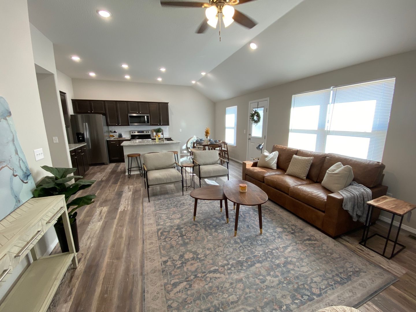 Stainless refrigerator, stove, dishwasher, and microwave provided