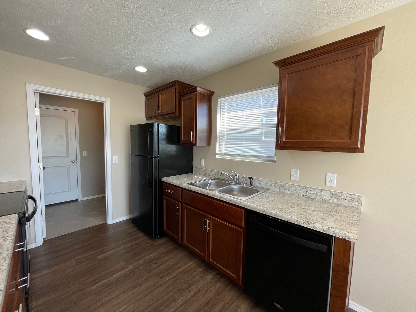 Kitchen equipped with refrigerator, stove, dishwasher, and microwave
